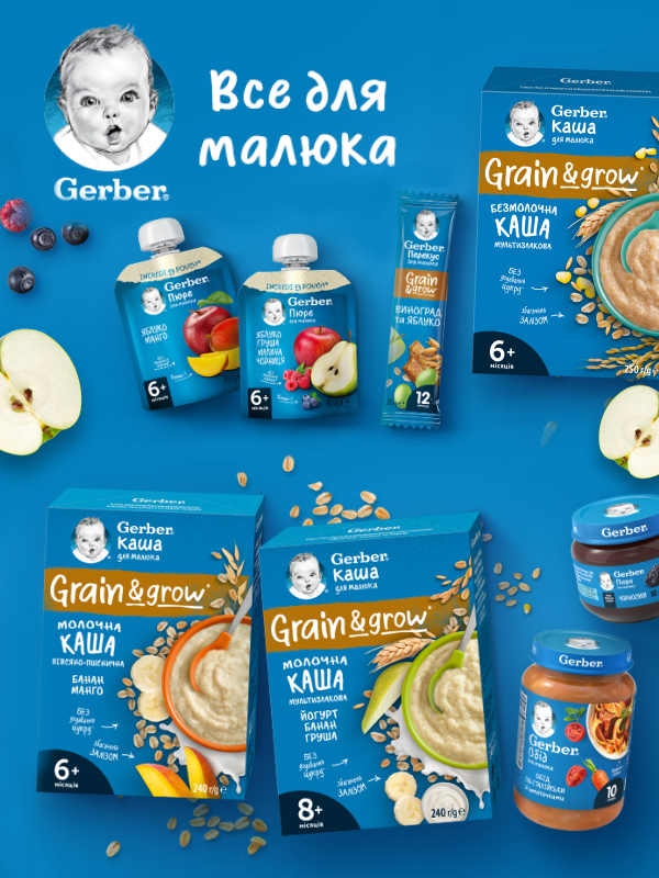 Компания Гербер также производит быстрорастворимые каши: молочная и безмолочная, мультизлаковая и овсяно-пшеничная, с разными фруктами и йогуртом, которые рекомендовано вводить в прикорм ребенка с 6 месяцев. Производитель Gerber в каши добавляет железо, ведь этот элемент способствует развитию когнитивной функции мозга. А сухая молочная мультизлаковая каша Gerber поможет познакомить малыша с глютеном.