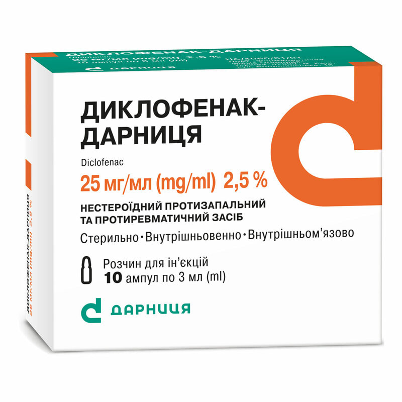 Описание препарата Диклофенак-Дарница р-р д/ин. 25мг/мл амп. 3мл №10 на этой странице — упрощенная авторская версия сайта apteka911, созданная на основании инструкции/ий по применению. Перед приобретением или использованием препарата вы должны проконсультироваться с врачом и ознакомиться с оригинальной инструкцией производителя (прилагается к каждой упаковке препарата).