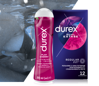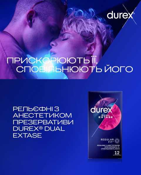 Презервативи Durex® Dual Extase призначені для одночасного оргазму чоловіка та жінки: крапки та ребра прискорюють її, а анестетик всередині презерватива сповільнює його!