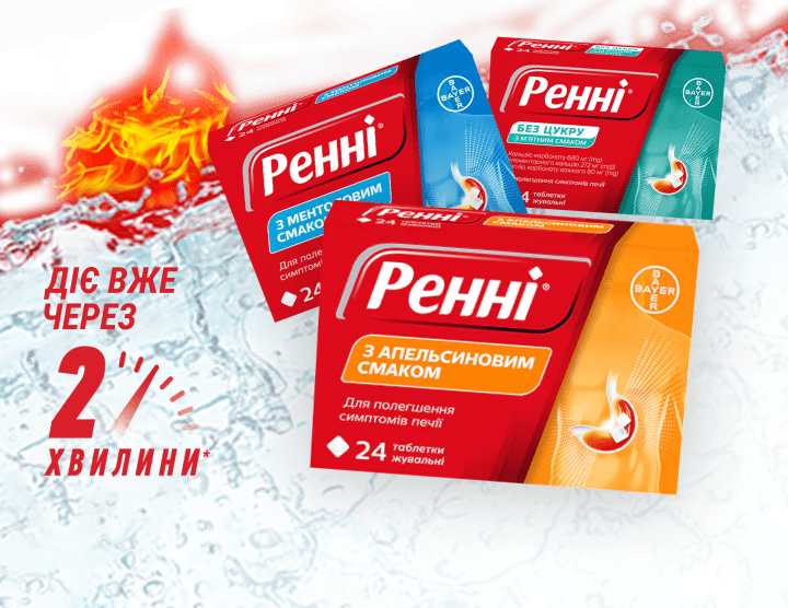 Ренні® не містить складних хімічних формул, простота – ключ до успіху. Кальцію карбонат і магнію карбонат є природними компонентами, які діють локально в шлунку, перетворюючи надлишок кислоти у воду і інші нешкідливі речовини. Карбонат кальцію працює швидко*, в той час як карбонат магнію починає діяти згодом, але при цьому значно подовжуючи антацидний ефект. Разом вони протягом кількох хвилин* нейтралізують надлишок кислоти у шлунку, позбавляючи людину від неприємних відчуттів.