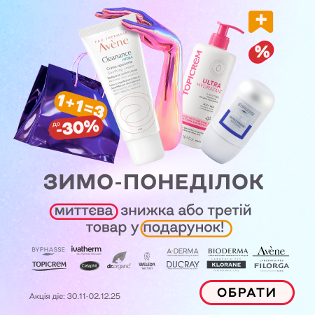 Акція діє з 30.11.2025 до 02.12.2025 року в усіх аптечних закладах-партнерах електронної медичної інформаційної системи Аптека 9-1-1. 1+1=3 в межах кожного бренду окремо:ТМ A-DERMA, AVENE, BIODERMA, DUCRAY, FILORGA, KLORANE, LIERAC, MARTIDERM, NOREVA, NUXE, PHYTO, Roger&Gallet. Оформіть замовлення 3х одиниць косметики одного бренду, щоб отримати третю у подарунок*. Пропозиція застосується автоматично після вибору способу доставки та діятиме на товар з найнижчою вартістю. *Під подарунком розуміється його купівля за 0.10 грн. Знижка до -30% діє на решту брендів з даної сторінки.
