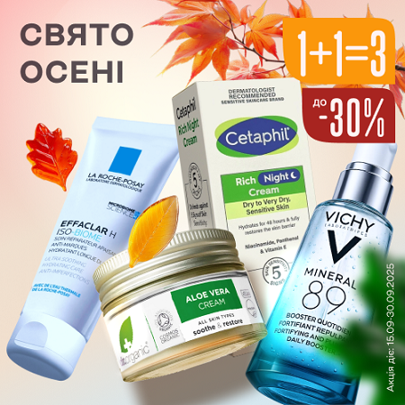 Акція діє з 15.09.2025 до 30.09.2025 року в усіх аптечних закладах-партнерах електронної медичної інформаційної системи Аптека 9-1-1. 1+1=3 на ТМ VICHY та LA ROCHE-POSAY (між брендами). Оформіть замовлення 3х одиниць косметики цих брендів, щоб отримати третю у подарунок*. Пропозиція застосується автоматично після вибору способу доставки та діятиме на товар з найнижчою вартістю. *Під подарунком розуміється його купівля за 0.10 грн. Знижка до -30% діє на всі бренди з даної сторінки окрім ТМ VICHY, LA ROCHE-POSAY та BABE LABORATORIOS (-40% на другу одиницю).