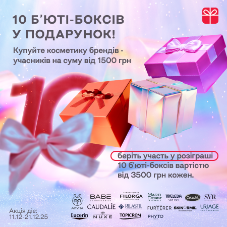 Офіційні правила акції Святковий настрій у кожній покупці! З 11 по 21 грудня купуй улюблену косметику брендів APIVITA, BABE LABORATORIOS, CAUDALIE, CETAPHIL, EUCERIN, FILORGA, MARTIDERM, NUXE, PHYTO, RENE FURTERER , RILASTIL, SKINORMIL, SVR, TOPICREM, URIAGE, WELEDA на суму від 1500 грн та вигравай один із 10 б’юті-боксів! Купуй на сайті apteka911.ua, у мережі аптек «Аптека 9-1-1», «Аптека Оптових Ц…», у чат-ботах — і автоматично бери участь у розіграші (достатньо бути учасником програми лояльності). Акція також діє при оформленні замовлень з доставкою Новою поштою та Укрпоштою. Переможців оберемо чесно та прозоро через random.org і оголосимо до 26 грудня. Результати будуть опубліковані у розділі новин на сайті, в тг боті та на інстаграм сторінці. Даруй собі красу та вигравай подарунки!