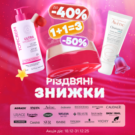 Акція діє з 18.12.2025 по 31.12.2025 в усіх аптечних закладах-партнерах електронної медичної інформаційної системи «Аптека 9-1-1», за наявності товару. 1+1=3 в межах одного бренду Придбайте 3 одиниці косметики одного бренду та отримайте третю позицію у подарунок*. Акція діє для брендів: TOPICREM, LA ROCHE-POSAY, VICHY, CERAVE. Пропозиція застосовується автоматично після вибору способу доставки та поширюється на товар із найнижчою вартістю. * Під подарунком мається на увазі можливість придбати товар за 0,10 грн. –50% на другу одиницю в межах одного бренду Знижка діє для брендів: BABE LABORATORIOS, BIOTRADE. Знижка до –40% Діє на інші бренди, представлені на цій сторінці. Увага! Акція для брендів LA ROCHE-POSAY, VICHY, CERAVE, APIVITA, EUCERIN, EYE CARE, ITEM, SKINORMIL, SVR, URIAGE стартує з 22.12.2025 року.