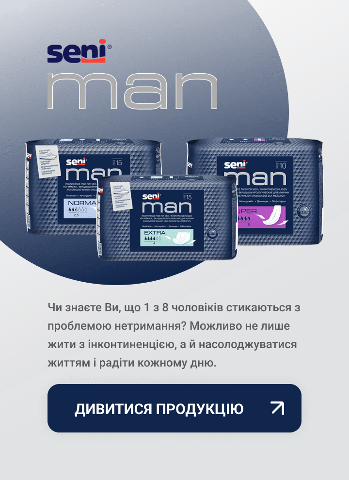Урологічні прокладки та вбираюча білизна для чоловіків Seni Man спеціально розроблені для анатомічних особливостей чоловічого тіла і забезпечують комфорт та захист при нетриманні сечі від легкого до середнього ступеня за допомогою анатомічної форми, «дихаючого» матеріалу, суперабсорбенту для нейтралізації запаху та бічних бортиків проти протікання. Чоловічі прокладки (Seni Man) мають форму човника для кращого прилягання до чоловічої анатомії і кріпляться до білизни клейкою смугою, тоді як Seni Man Pants – це вбираючі трусики для більшої впевненості.