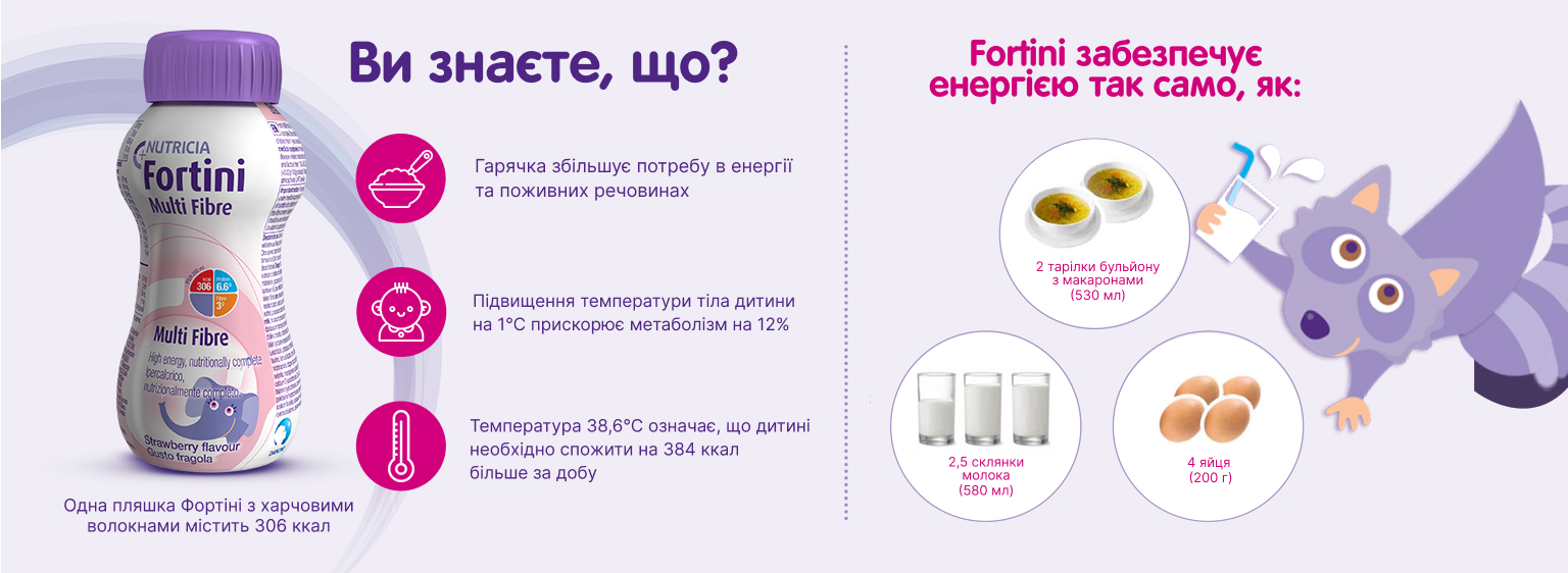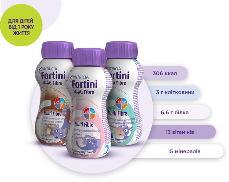 Дитяче ентеральне харчування – харчовий продукт для спеціальних медичних цілей Фортіні / Fortini з харчовими волокнами зі смаком шоколаду. Напій рідкий, готовий до вживання, повноцінний, високоенергетичний, для дітей від 1 року, які не бажають або не здатні споживати достатню кількість звичайних продуктів для задоволення власних харчових потреб.