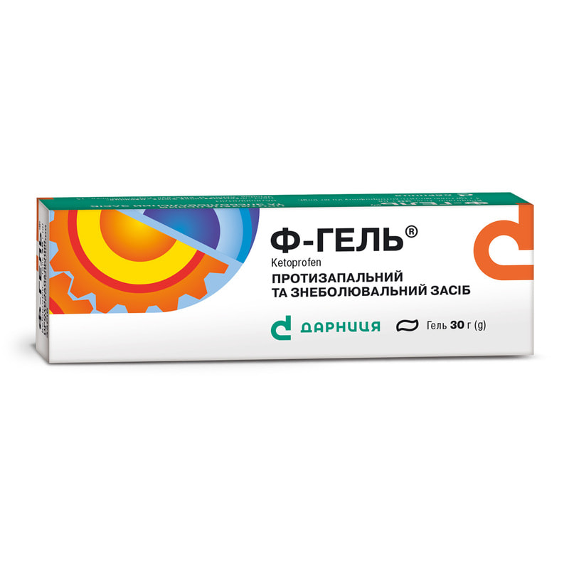 Фармакодинаміка. діюча речовина препарату ф-гель - кетопрофен - відноситься до групи нестероїдних протизапальних засобів, похідних арілпропіоновой кислоти. кетопрофен виявляє аналгетичну і протизапальну дію внаслідок гальмування дії ЦОГ-1, ЦОГ-2 і брадикініну, стабілізації лізосомальних мембран і гальмування міграції макрофагів. володіє аналгетичну і протизапальну активність як на ранній (судинної фазі), так і на пізній стадії (клітинної фазі) запальної реакції. також препарат гальмує агрегацію тромбоцитів.