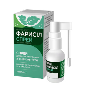 Опис лікарського засобу/медичного виробу Фарисіл спрей від болю в горлі спрей д/ротов. пор. м'ята 1,5мг/мл конт. 30мл на цій сторінці підготовлений на підставі інструкції про його застосування та надається виключно на виконання вимог Закону України «Про захист прав споживачів». Перед застосуванням лікарського засобу/медичного виробу слід ознайомитись з інструкцією про його застосування та проконсультуватись з лікарем. Пам’ятайте, самолікування може бути шкідливим для Вашого здоров’я.