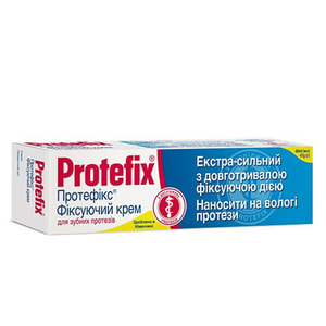 Класичний фіксуючий крем Protefix® (Протефікс) рекомендується для надійної фіксації при підвищеному і нормальному слиновиділенні. Він легко наноситься на вологі зубні протези, зберігає свої властивості під впливом гарячої і холодної їжі, не змінює смак їжі і напоїв, перешкоджає проникненню їжі під протез і не завдає негативного впливу на шлунок.