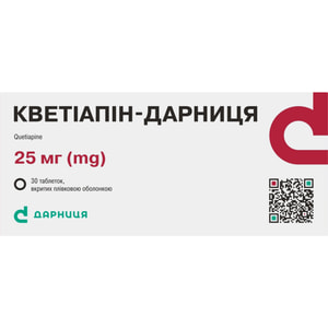Опис лікарського засобу/медичного виробу Кветіапін-Дарниця табл. в/о 25мг №30 на цій сторінці підготовлений на підставі інструкції про його застосування та надається виключно на виконання вимог Закону України «Про захист прав споживачів». Перед застосуванням лікарського засобу/медичного виробу слід ознайомитись з інструкцією про його застосування та проконсультуватись з лікарем. Пам’ятайте, самолікування може бути шкідливим для Вашого здоров’я.