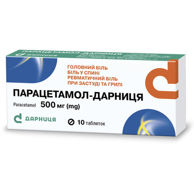 Опис лікарського засобу/медичного виробу Парацетамол-Дарниця табл. 500мг №10 на цій сторінці підготовлений на підставі інструкції про його застосування та надається виключно на виконання вимог Закону України «Про захист прав споживачів». Перед застосуванням лікарського засобу/медичного виробу слід ознайомитись з інструкцією про його застосування та проконсультуватись з лікарем. Пам’ятайте, самолікування може бути шкідливим для Вашого здоров’я.
