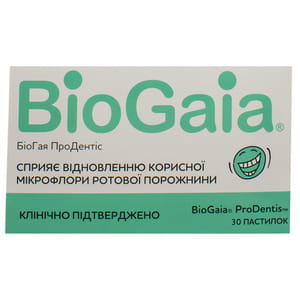 БіоГая ПроДентіс – це запатентована комбінація двох штамів Lactobacillus reuteriDSM 17938 та Lactobacillus reuteri ATCC PTA 5289 з активною дією в ротоглотці: вони антагоністично витісняють збудників карієсу, періодонтиту, гінгівіту та інших запальних захворювань, сприяють зменшенню запалення та кровоточивості слизової оболонки, підтримують здоровий стан слизової оболонки та зубів. БіоГая ПроДентіс сприяє відновленню корисної мікрофлори ротової порожнини, підтримує її здоровий баланс, перешкоджає розмноженню хвороботворних мікроорганізмів. L. reuteri Prodentis® колонізують клітини епітелію (прикріплюються до них), що вистилають весь шлунково-кишковий тракт, починаючи з ротової порожнини. Сприяють зменшенню запалення слизової оболонки ротової порожнини, пригнічуючи прозапальний цитокін TNF – альфа та інтерлейкіни IL-6, IL-8. Антимікробний механізм дії L. reuteri Prodentis® полягає в секреції натуральних інгібіторів росту широкого спектра патогенних мікроорганізмів реутеріна та рейтероцикліна, що властиві тільки даним мікроорганізмам. L. reuteri Prodentis® – штами бактерій, що відповідають сучасним вимогам Продовольчої й Сільськогосподарської організації ООН (Food and Agriculture Organization of the United Nations – FAO) і ВООЗ (2002 р.) до пробіотиків.