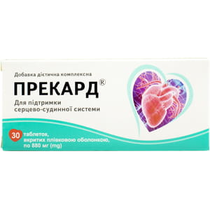 Добавка дієтична комплексна Прекард® може бути рекомендована для вживання в якості добавки до раціону харчування з метою підтримки у фізіологічних межах серцево-судинної системи, профілактики нейроциркуляторної дистонії, хронічної ішемічної хвороби серця, серцевої недостатності, інфаркту міокарда, зниження втоми організму людини, підвищення працездатності та переносимості фізичних навантажень, покращення настрою; чинить заспокійливу та нейропротекторну дію (усуває соматонегативнi порушення – дратівливiсть, зміни настрою).