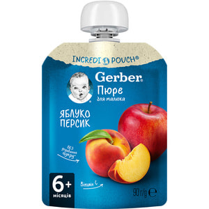 Дитяче фруктове пюре NESTLE GERBER Яблуко і персик в м'якій упаковці (90 г) - це 100% натуральних фруктів + вітамін С! Нову м'яку упаковку «павукові» легко брати на прогулянку, в подорож або в гості. До того ж, вона сприяє розвитку навичок самостійності у малюка.
